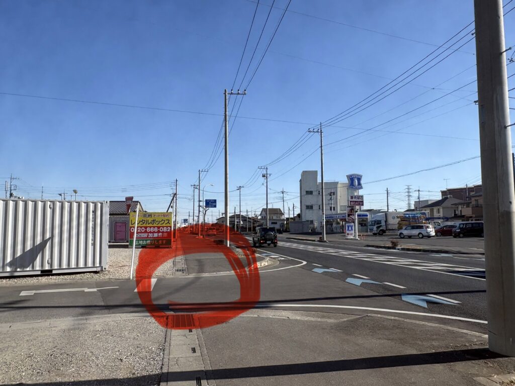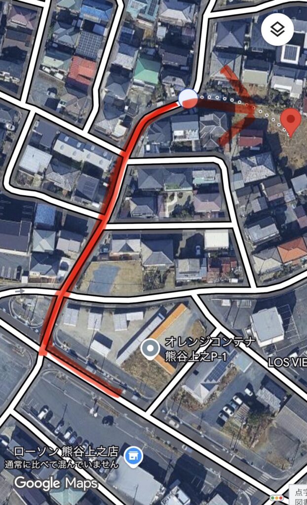 ①最寄りのコンビニ「ローソン熊谷上之店様」を左に進んで、ローソンさんを通りすぎたら、一つ目の小さな交差点(信号機はない)を右に入ります。※右に曲がる